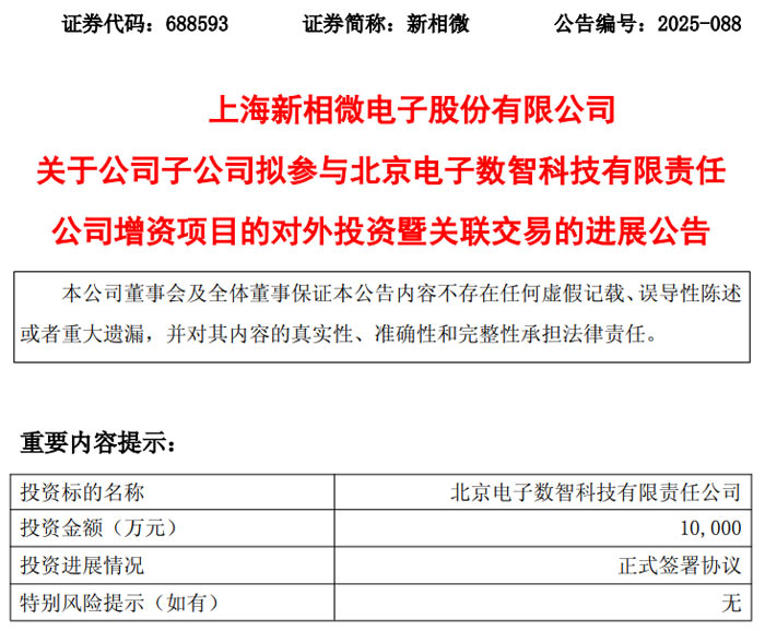2025 年 12 月 23 日,上海新相微電子股份有限公司(證券代碼:688593,證券簡(jiǎn)稱:新相微)發(fā)布公告,披露其全資子公司上海新相技術(shù)有限公司(以下簡(jiǎn)稱 “上海新相”)參與北京電子數(shù)智科技有限責(zé)任公司(以下簡(jiǎn)稱 “北電數(shù)智”)增資項(xiàng)目的進(jìn)展,目前相關(guān)投資主體已正式簽署增資及股東相關(guān)協(xié)議,標(biāo)志著本次對(duì)外投資暨關(guān)聯(lián)交易進(jìn)入實(shí)質(zhì)性落地階段。
