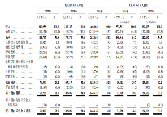 截至 2025 年 9 月 30 日,公司已構(gòu)建豐富的產(chǎn)品組合,包括 151 種智能視頻芯片和 110 種互連芯片,形成覆蓋采集、連接、處理及顯示的端到端解決方案。2022 年、2023 年、2024 年及 2025 年前九月分別實(shí)現(xiàn)收入人民幣 2.41 億元、3.23 億元、4.66 億元及 3.89 億元,2022-2024 年復(fù)合年增長(zhǎng)率達(dá) 39.1%。