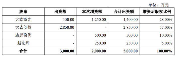 根據(jù)公告披露,大族聚維本次擬通過(guò)增資擴(kuò)股增加注冊(cè)資本 2000 萬(wàn)元,注冊(cè)資本將由原來(lái)的 3000 萬(wàn)元增至 5000 萬(wàn)元。本次增資由多方共同參與,其中,大族激光擬出資 1250 萬(wàn)元認(rèn)購(gòu)新增注冊(cè)資本 1250 萬(wàn)元;員工持股平臺(tái)深圳市族思聚優(yōu)咨詢合伙企業(yè)(有限合伙)(以下簡(jiǎn)稱 “族思聚優(yōu)”)擬出資 500 萬(wàn)元認(rèn)購(gòu)新增注冊(cè)資本 500 萬(wàn)元;大族聚維董事長(zhǎng)趙光輝擬出資 250 萬(wàn)元認(rèn)購(gòu)新增注冊(cè)資本 250 萬(wàn)元。此外,大族激光及全資子公司深圳市大族創(chuàng)業(yè)投資有限公司(以下簡(jiǎn)稱 “大族創(chuàng)投”)放棄本次增資其余部分的優(yōu)先認(rèn)購(gòu)權(quán)。