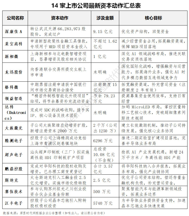 年末收官節(jié)點(diǎn),科技制造業(yè)資本運(yùn)作迎來(lái) “密集窗口期”。近期,深康佳、萊寶高科、龍迅股份、領(lǐng)益智造等 14 家半導(dǎo)體、顯示及電子制造企業(yè)扎堆披露資本動(dòng)作,股權(quán)優(yōu)化、融資擴(kuò)容、技術(shù)并購(gòu)、跨境上市等多元化舉措密集落地 —— 從數(shù)十億級(jí)股權(quán)轉(zhuǎn)讓到專項(xiàng)技術(shù)融資,從 AI 領(lǐng)域戰(zhàn)略增資到 MicroLED 賽道布局,不僅勾勒出行業(yè)向高端化、智能化進(jìn)階的清晰路徑,更凸顯資本向創(chuàng)新驅(qū)動(dòng)型產(chǎn)業(yè)聚集的鮮明導(dǎo)向。