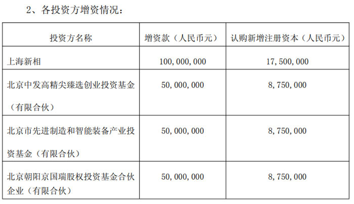 本次北電數(shù)智增資項(xiàng)目共有四家投資主體參與,除上海新相外,還包括北京中發(fā)高精尖臻選創(chuàng)業(yè)投資基金(有限合伙)、北京市先進(jìn)制造和智能裝備產(chǎn)業(yè)投資基金(有限合伙)、北京朝陽(yáng)京國(guó)瑞股權(quán)投資基金合伙企業(yè)(有限合伙)。具體增資情況如下: