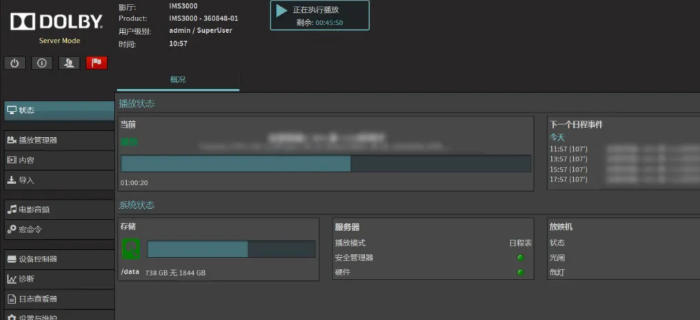 除了精準(zhǔn)適配高幀率與3D規(guī)格,杜比IMS3000的高效運維能力也為影院應(yīng)對觀影熱潮提供了保障。影片4K 3D 48幀版本的DCP文件數(shù)據(jù)量大,對傳輸與導(dǎo)入效率要求極高,服務(wù)器支持通過以太網(wǎng)(最高500 Mbps)、eSATA、USB 3.0等多種方式高速導(dǎo)入內(nèi)容,更具備“邊傳輸邊播放”“關(guān)機(jī)上載”等特色功能,大幅縮短影片上線周期,助力影院快速響應(yīng)排片需求。同時,其基于網(wǎng)絡(luò)的操作界面與藍(lán)牙移動控制功能(需搭配專用USB適配器與APP),讓工作人員可通過影院網(wǎng)絡(luò)或移動設(shè)備輕松完成排期、播放列表編輯等操作,提升運營效率。