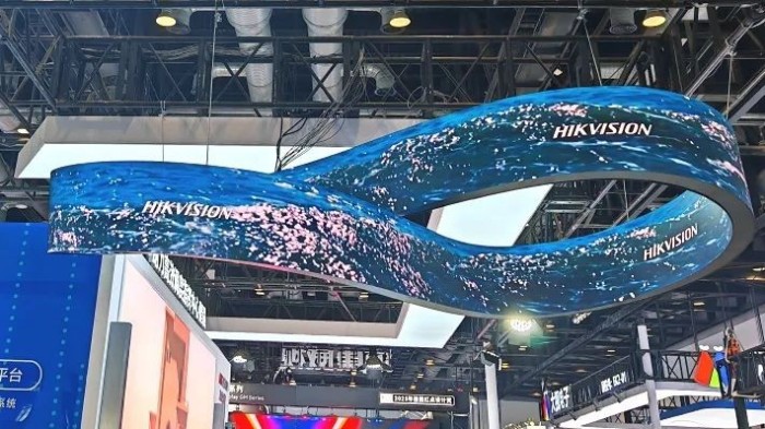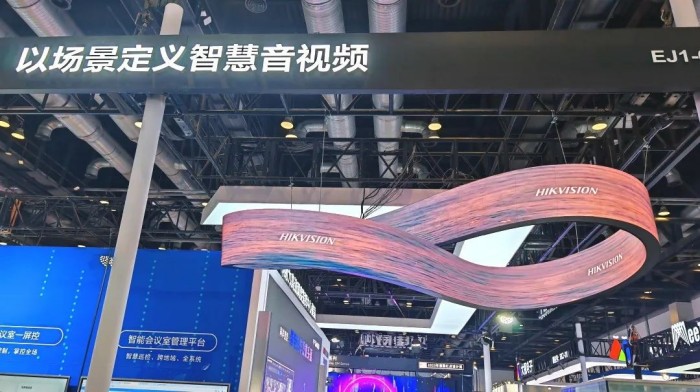 在整個展臺的門口,是我們的創(chuàng)意顯示屏幕-莫比烏斯環(huán),環(huán)形的形狀也是為了體現(xiàn)海康今年“以場景定義智慧音視頻”的主題,我們把通過場景來定義業(yè)務(wù),融合打通產(chǎn)品,發(fā)揮比單產(chǎn)品更大的價值。
