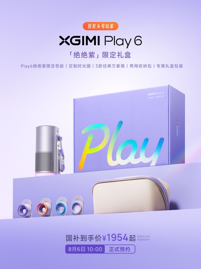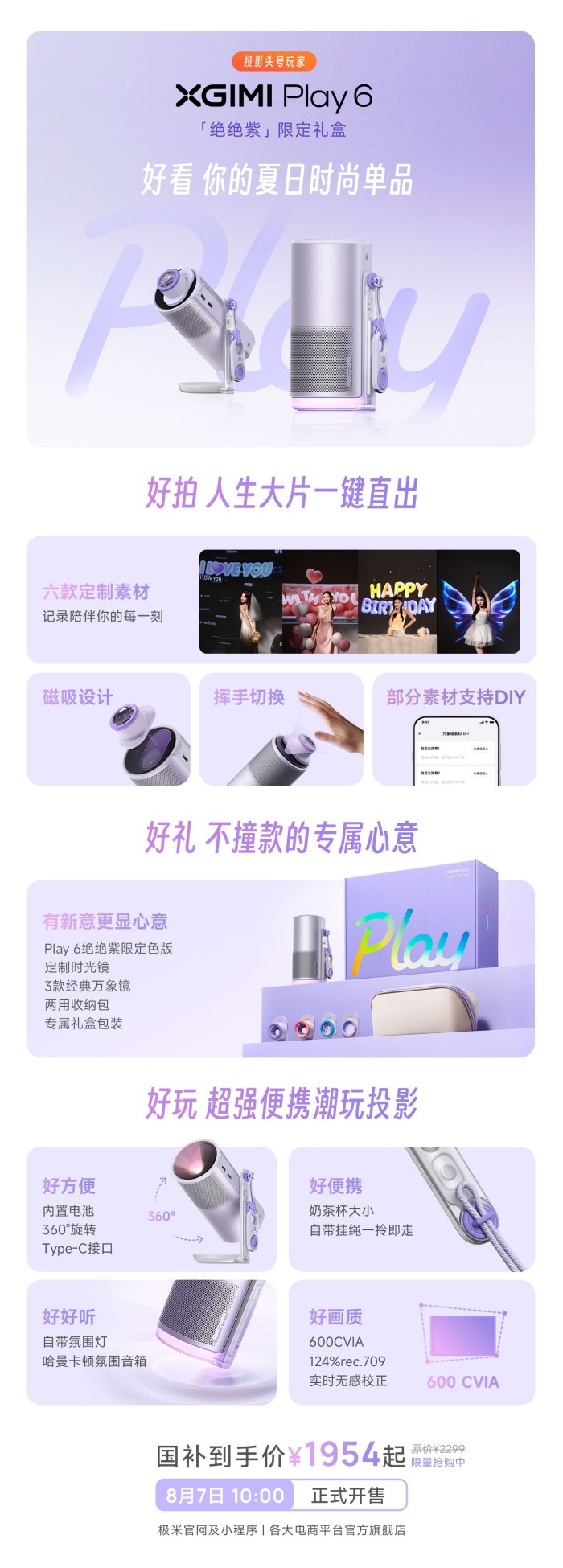 近日,極米官方正式發(fā)布Play6「絕絕紫」限定禮盒,并將于8月7日上午10點(diǎn)正式開售。