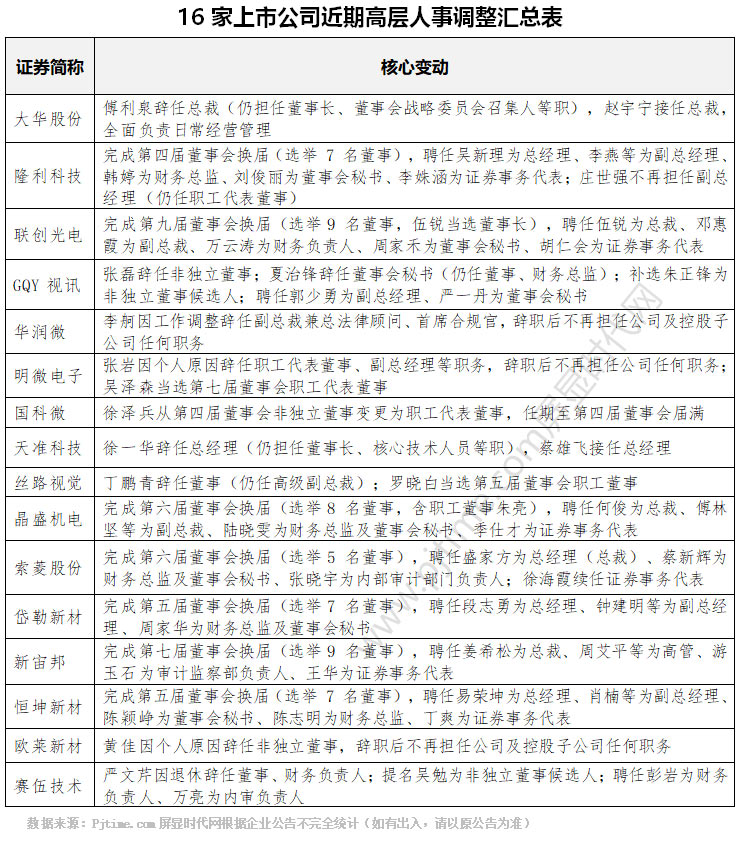 大華股份、GQY、隆利科技、聯(lián)創(chuàng)光電、華潤(rùn)微、明微電子、晶盛機(jī)電等16企披露最新人事變動(dòng)