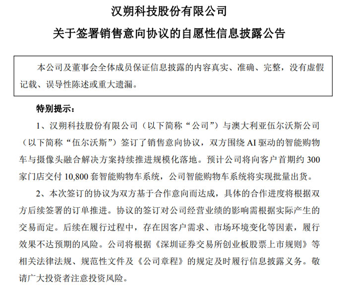 2026 年 1 月 5 日,漢朔科技股份有限公司(證券代碼:301275,證券簡稱:漢朔科技)發(fā)布自愿性信息披露公告,宣布與澳大利亞著名大型食品零售商伍爾沃斯公司(ISIN:AU000000WOW2,證券代碼:WOW)簽署《智能購物車及攝像頭銷售意向協(xié)議》,雙方將圍繞 AI 驅(qū)動的智能購物車與攝像頭融合解決方案推進聯(lián)合創(chuàng)新及規(guī);涞,公司智能購物車系統(tǒng)即將實現(xiàn)批量出貨。