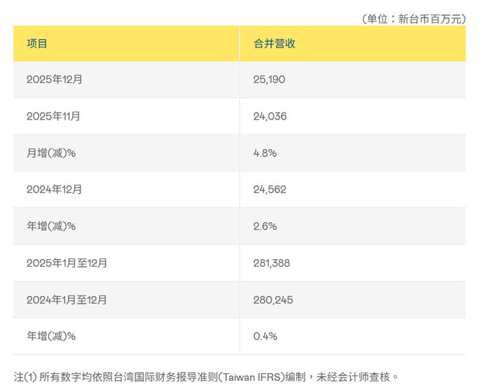 2025 年第四季度,公司合并營(yíng)收為新臺(tái)幣 568 億元(56,768 百萬(wàn)元):較第三季度的 578.18 億元(57,818 百萬(wàn)元)環(huán)比小幅減少 1.82%;較 2024 年同期季度營(yíng)收同比增長(zhǎng) 5.74%,季度營(yíng)收保持同比擴(kuò)張態(tài)勢(shì)。