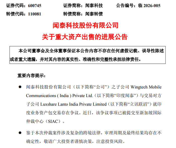 2026 年 1 月 12 日晚間,聞泰科技股份有限公司發(fā)布重大資產出售進展公告,披露公司旗下印度業(yè)務資產包交易引發(fā)爭議,相關事項已被提交至新加坡國際仲裁中心(SIAC),其余標的資產則已完成權屬變更登記。