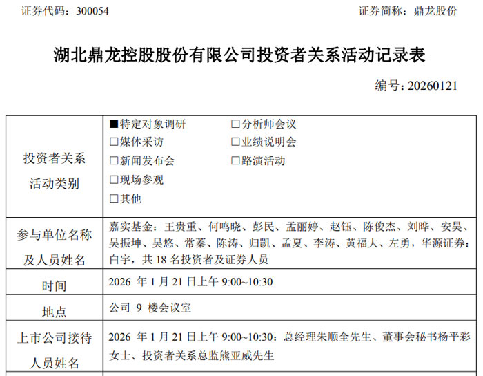 2026 年 1 月 21 日上午 9:00-10:30,湖北鼎龍控股股份有限公司(證券代碼:300054,證券簡(jiǎn)稱:鼎龍股份)舉辦特定對(duì)象調(diào)研活動(dòng),接待了嘉實(shí)基金、華源證券等機(jī)構(gòu)的 18 名投資者及證券人員。公司總經(jīng)理朱順全先生、董事會(huì)秘書楊平彩女士、投資者關(guān)系總監(jiān)熊亞威先生出席活動(dòng),就公司業(yè)務(wù)布局、核心競(jìng)爭(zhēng)力、研發(fā)規(guī)劃及行業(yè)機(jī)遇等問題與調(diào)研機(jī)構(gòu)進(jìn)行深入交流。