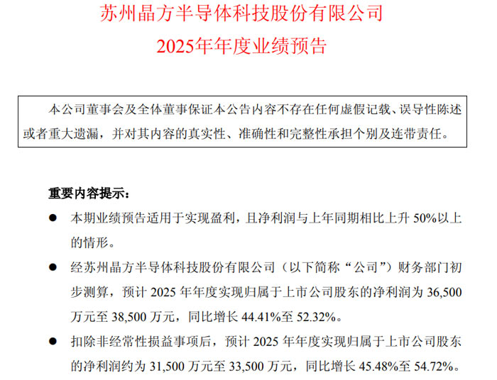 2026 年 1 月 23 日晚間,蘇州晶方半導(dǎo)體科技股份有限公司(證券代碼:603005,證券簡稱:晶方科技)發(fā)布 2025 年年度業(yè)績預(yù)告,公司預(yù)計(jì)全年業(yè)績實(shí)現(xiàn)顯著增長,歸屬于上市公司股東的凈利潤及扣非后凈利潤均同比大幅提升。