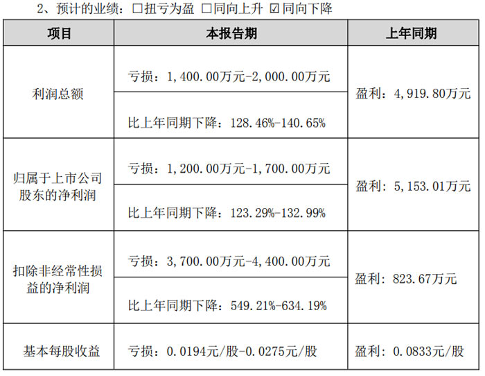 歸屬于上市公司股東的凈利潤(rùn)預(yù)計(jì)虧損 1200.00 萬(wàn)元 - 1700.00 萬(wàn)元,上年同期為盈利 5153.01 萬(wàn)元,同比下降 123.29%-132.99%;
