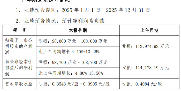 業(yè)績預(yù)告期間為 2025 年 1 月 1 日至 2025 年 12 月 31 日。數(shù)據(jù)顯示,公司歸屬于上市公司股東的凈利潤預(yù)計(jì)虧損 98,000 萬元至 108,000 萬元,上年同期虧損 112,974.92 萬元,同比增長 4.40%-13.26%;扣除非經(jīng)常性損益后的凈利潤預(yù)計(jì)虧損 98,700 萬元至 108,700 萬元,上年同期虧損 114,178.19 萬元,同比增長 4.80%-13.56%;基本每股收益預(yù)計(jì)虧損 0.3543 元 / 股至 0.3905 元 / 股,上年同期虧損 0.4084 元 / 股。