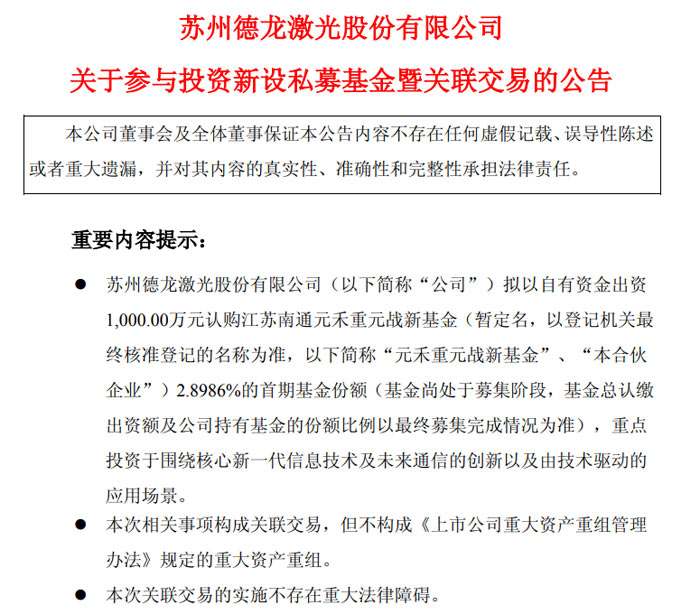 2026 年 1 月 28 日,蘇州德龍激光股份有限公司(證券代碼:688170,證券簡稱:德龍激光)發(fā)布公告,稱公司擬以自有資金 1000 萬元認(rèn)購江蘇南通元禾重元戰(zhàn)新基金(暫定名,最終以登記機關(guān)核準(zhǔn)名稱為準(zhǔn))2.8986% 的首期基金份額,借此圍繞主營業(yè)務(wù)進行產(chǎn)業(yè)布局,把握新興產(chǎn)業(yè)發(fā)展機遇。
