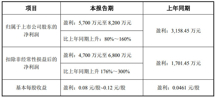 其中,歸屬于上市公司股東的凈利潤預(yù)計盈利 5700 萬元至 8200 萬元,上年同期盈利 3158.45 萬元,同比增長 80%~160%;扣除非經(jīng)常性損益后的凈利潤預(yù)計盈利 4700 萬元至 6800 萬元,上年同期盈利 1701.45 萬元,同比增長 176%~300%;基本每股收益預(yù)計盈利 0.08 元 / 股~0.12 元 / 股,上年同期盈利 0.0461 元 / 股。