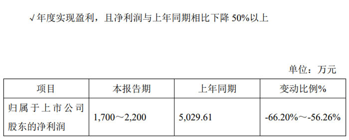 成都成電光信科技股份有限公司預(yù)計本期公司年度實現(xiàn)盈利,但歸屬于上市公司股東的凈利潤較上年同期出現(xiàn)大幅下降,降幅超 50%。具體來看,本報告期歸屬于上市公司股東的凈利潤預(yù)計為 1700 萬元至 2200 萬元,上年同期該數(shù)據(jù)為 5029.61 萬元,同比變動比例為 - 66.20% 至 - 56.26%。