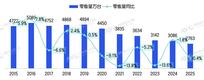 2025年,中國(guó)彩電市場(chǎng)在多重壓力交織下迎來(lái)深度調(diào)整期。房地產(chǎn)低迷、消費(fèi)信心不足等傳統(tǒng)壓力尚未緩解,智能手機(jī)、平板電腦等替代產(chǎn)品對(duì)家庭娛樂(lè)場(chǎng)景的分流效應(yīng)進(jìn)一步凸顯,成為市場(chǎng)下行的誘因之一。然而,在整體規(guī)模萎縮的背后,市場(chǎng)結(jié)構(gòu)正在發(fā)生深刻變革:大屏化、節(jié)能化、高端化成為產(chǎn)品升級(jí)的核心主線,渠道格局呈現(xiàn)線上線下分化與融合并存的特征,Mini LED等關(guān)鍵技術(shù)的加速普及則為行業(yè)注入新的增長(zhǎng)動(dòng)能。中國(guó)彩電市場(chǎng)規(guī)模表現(xiàn)