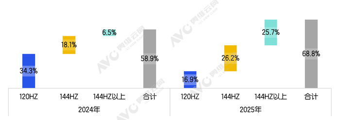 近年來(lái),彩電產(chǎn)品的發(fā)展呈現(xiàn)出明顯的場(chǎng)景化趨勢(shì),針對(duì)不同使用環(huán)境和用戶需求進(jìn)行深度定制。其中,觀影和游戲作為家庭娛樂(lè)的兩大核心場(chǎng)景,受到了市場(chǎng)和消費(fèi)者的廣泛關(guān)注。伴隨著顯示技術(shù)的不斷突破,高刷新率成為提升視覺(jué)體驗(yàn)的關(guān)鍵指標(biāo)之一。奧維云網(wǎng)(AVC)推總數(shù)據(jù)顯示,2025年中國(guó)彩電市場(chǎng)120HZ及以上產(chǎn)品銷量滲透率已達(dá)68.8%,其中144HZ作為更高階刷新率的主流參數(shù),全年銷量為724萬(wàn)臺(tái),同比增長(zhǎng)29.6%。2024-2025年中國(guó)彩電市場(chǎng)刷新率零售量結(jié)構(gòu)