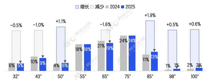 2025年中國(guó)彩電市場(chǎng)重點(diǎn)尺寸零售量同比