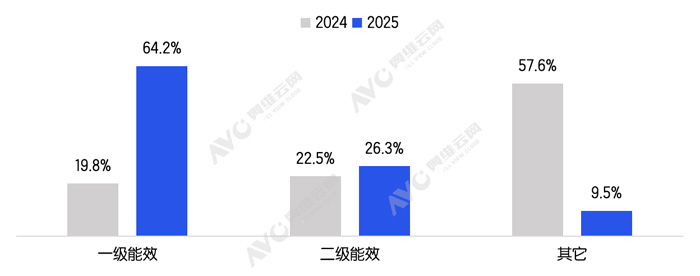 在國(guó)家大力推行的以舊換新政策引導(dǎo)下,綠色節(jié)能已成為2025年彩電行業(yè)發(fā)展的主要趨勢(shì)和核心方向之一。這一趨勢(shì)不僅積極響應(yīng)了國(guó)家以舊換新政策中對(duì)節(jié)能環(huán)保產(chǎn)品的明確要求,更成為各大彩電品牌提升產(chǎn)品核心競(jìng)爭(zhēng)力和市場(chǎng)份額的重要戰(zhàn)略舉措。奧維云網(wǎng)(AVC)推總數(shù)據(jù)顯示,2025年彩電市場(chǎng)一級(jí)能效產(chǎn)品零售量占比高達(dá)64.2%,較去年全年提升44.3個(gè)百分點(diǎn)。高效節(jié)能的產(chǎn)品不僅能夠顯著幫助消費(fèi)者減少長(zhǎng)期使用過(guò)程中的電費(fèi)支出,降低總體擁有成本,還高度契合國(guó)家以舊換新政策和“雙碳”戰(zhàn)略目標(biāo)的環(huán)保要求。因此,這類產(chǎn)品在市場(chǎng)上不僅獲得了更多消費(fèi)者的認(rèn)可和青睞,同時(shí)也得到了政府相關(guān)補(bǔ)貼和政策支持,實(shí)現(xiàn)了經(jīng)濟(jì)效益與社會(huì)效益的雙贏。2024-2025年中國(guó)彩電市場(chǎng)能效等級(jí)產(chǎn)品零售量結(jié)構(gòu)