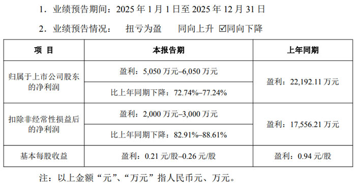 近日,深圳萬潤(rùn)科技股份有限公司(證券代碼:002654,證券簡(jiǎn)稱:萬潤(rùn)科技)發(fā)布 2025 年度業(yè)績(jī)預(yù)告。公司預(yù)計(jì)凈利潤(rùn)為正值但同比同向下降。具體財(cái)務(wù)數(shù)據(jù)如下:歸屬于上市公司股東的凈利潤(rùn)預(yù)計(jì)盈利 2500 萬元–3700 萬元,上年同期盈利 6272.54 萬元,同比下降 60.14%-41.01%;扣除非經(jīng)常性損益后的凈利潤(rùn)預(yù)計(jì)盈利 1200 萬元–1750 萬元,上年同期盈利 1736.35 萬元,較上年同期變動(dòng)幅度為下降 30.89% 至增長(zhǎng) 0.79%;基本每股收益預(yù)計(jì)盈利 0.03 元 / 股–0.04 元 / 股,上年同期盈利 0.07 元 / 股。