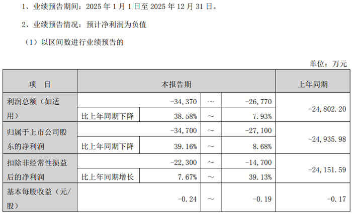 昆山龍騰光電股份有限公司(以下簡(jiǎn)稱 “公司”)發(fā)布 2025 年年度業(yè)績(jī)預(yù)告,公司預(yù)計(jì)實(shí)現(xiàn)歸屬于母公司所有者的凈利潤(rùn)為 - 22,500.00 萬元至 - 19,300.00 萬元;預(yù)計(jì)實(shí)現(xiàn)歸屬于母公司所有者扣除非經(jīng)常性損益后的凈利潤(rùn)為 - 23,000.00 萬元至 - 19,800.00 萬元,與上年同期法定披露數(shù)據(jù)相比,虧損減少 6.81% 至 19.78%。