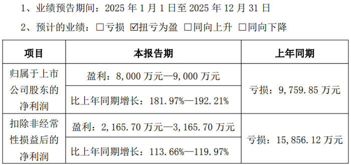 業(yè)績預(yù)告顯示,2025 年 1 月 1 日至 12 月 31 日期間,公司歸屬于上市公司股東的凈利潤預(yù)計為 8000 萬元 - 9000 萬元,相較于上年同期的虧損 9759.85 萬元,同比增長 181.97%-192.21%;扣除非經(jīng)常性損益后的凈利潤預(yù)計為 2165.70 萬元 - 3165.70 萬元,上年同期為虧損 15856.12 萬元,同比增長 113.66%-119.97%。