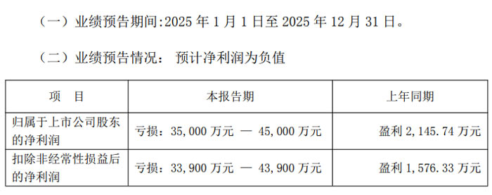 2026 年 1 月 30 日,天津經(jīng)緯輝開光電股份有限公司(證券代碼:300120,證券簡(jiǎn)稱:經(jīng)緯輝開)發(fā)布 2025 年度業(yè)績(jī)預(yù)告。公司歸屬于上市公司股東的凈利潤(rùn)預(yù)計(jì)虧損 35,000 萬元 - 45,000 萬元,而上年同期該指標(biāo)為盈利 2,145.74 萬元;扣除非經(jīng)常性損益后,歸屬于上市公司股東的凈利潤(rùn)預(yù)計(jì)虧損 33,900 萬元 - 43,900 萬元,上年同期則為盈利 1,576.33 萬元。