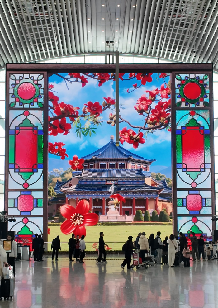 《廣州之窗》將巨幕巧妙轉(zhuǎn)化為一扇巨大的、充滿呼吸感的動(dòng)態(tài)滿洲窗,從朝陽(yáng)下的城市天際線到綴滿木棉花的紀(jì)念堂,讓旅客透過(guò)屏幕讀懂廣州的歷史底蘊(yùn)與現(xiàn)代活力。