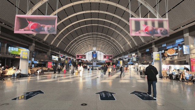 當(dāng)您穿過(guò)大廳,來(lái)到檢票口。這里是登車的必經(jīng)之地,也是人流最密集之處。沈陽(yáng)站部署了兩組洲明的巨型LED直角屏。細(xì)膩的色彩流轉(zhuǎn),既能清晰展示公共導(dǎo)引信息,又能放映品牌廣告或3D數(shù)字內(nèi)容,營(yíng)造活潑溫潤(rùn)的氛圍,消解了排隊(duì)時(shí)的枯燥感。