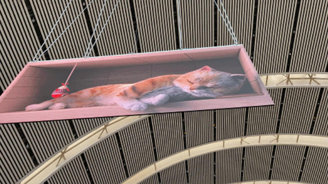 這里也是洲明獨(dú)創(chuàng)虛擬IP“大橘”的新家。屏幕中,憨態(tài)可掬的橘貓正追逐著玩具,尾巴輕掃,玩具仿佛要躍出屏幕......裸眼3D的視覺(jué)效果逼真靈動(dòng),希望這只“大橘”能讓許多趕路的旅客會(huì)心一笑,卸下路途的疲憊。