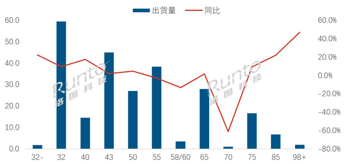 85英寸出貨量約670萬片,同比大幅增長22.2%,市場份額為2.7%,同比提升0.4個百分點。