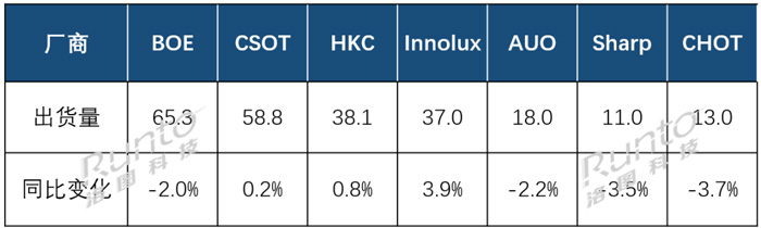 尾部三家廠商CHOT(彩虹光電)、Sharp(夏普)和LGD(樂金顯示)的出貨量有不同程度的下降。