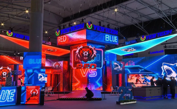 新亞勝展位的“YESphere”舞臺設(shè)計占地300平方,整合了地磚屏、異形屏、弧形屏、直角屏、吊裝屏和透明屏等租賃產(chǎn)品,構(gòu)建了一個層次豐富、功能互聯(lián)的立體創(chuàng)意空間,直觀呈現(xiàn)了“一屏通用、一屏百變”如何從產(chǎn)品理念,進階為完整的租賃舞臺解決方案。