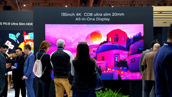 本次展出的108"/136"COB LED一體機采用海信獨家 3-in-1 ASIC 架構(gòu),結(jié)合共陰驅(qū)動技術(shù)與自研節(jié)能算法,在確保卓越畫質(zhì)的同時,功耗較上一代COB產(chǎn)品降低近20%,助力客戶實現(xiàn)可持續(xù)運營。同時,全球首發(fā)54"COB LED標牌產(chǎn)品,同樣采用海信自研ASIC架構(gòu),大尺寸標準箱體+COB大燈板設計,支持HDMI Daisy Chain, 滿足VESA壁掛標準,內(nèi)置VisionInfo, 可實現(xiàn)無縫拼接,方便客戶快速安裝,相比傳統(tǒng)LED拼接節(jié)能30%以上,備受觀眾矚目。