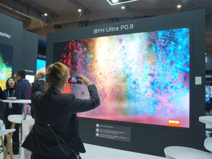 利亞德Hi-Micro LED首次公開亮相ISE展會,該產(chǎn)品采用Micro全倒裝無襯底芯片,最短邊尺寸<30μm,像素間距可實現(xiàn)0.4毫米的超高精度,體積更小、亮度更高、響應更快。通過創(chuàng)新的封裝工藝與制造流程,該產(chǎn)品在色彩表現(xiàn)、純黑顯示效果、色度視角三大指標上實現(xiàn)質(zhì)的飛躍,具備更高的耐用性與能效比。
