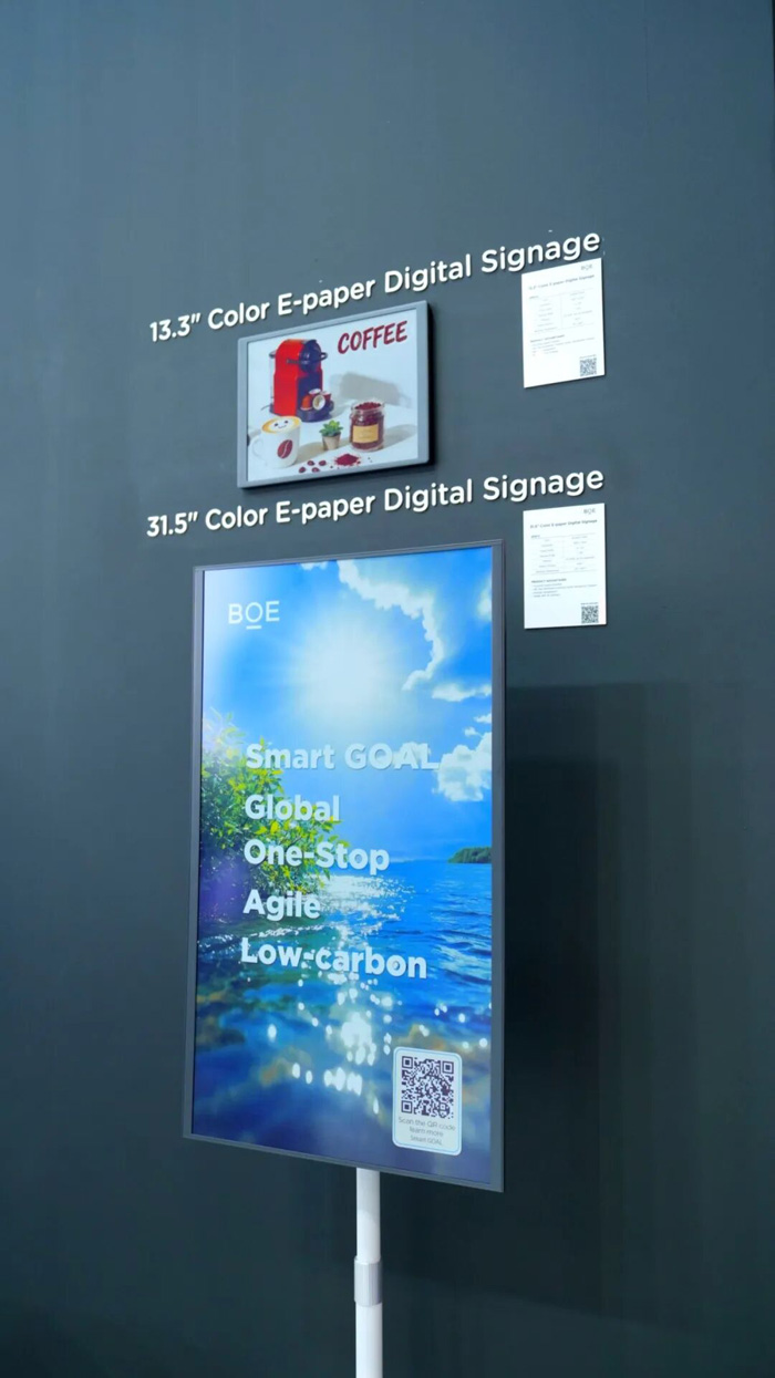 31.5英寸、13.3英寸全彩電子墨水屏支持多色顯示,低功耗特性為商超貨架堆頭、商鋪及電梯廣告牌帶來更為低碳環(huán)保的商顯解決方案。
