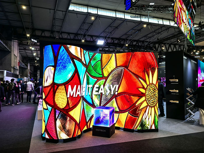 創(chuàng)意顯示區(qū)由UE系列展架屏與US系列柔性屏組合構(gòu)成,該方案高度兼容標準化展架系統(tǒng),強調(diào)快速部署、靈活造型與內(nèi)容便捷更換的能力,精準服務于對布展效率與創(chuàng)意呈現(xiàn)有雙重要求的展覽展示市場。
