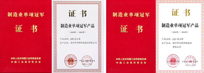 2019年、2022年,洲明LED顯示屏連續(xù)兩屆獲評“工信部制造業(yè)單項冠軍產品”。