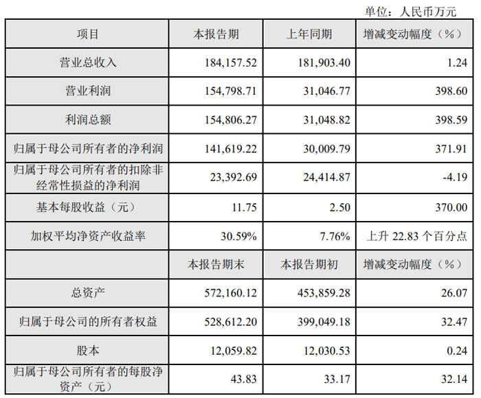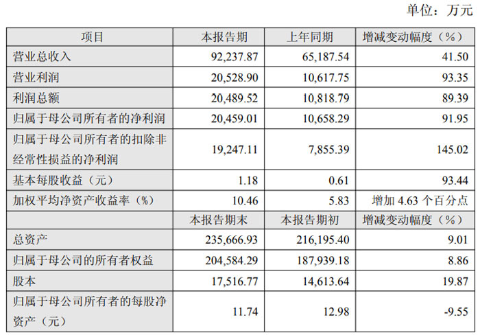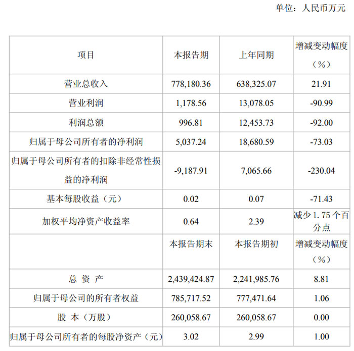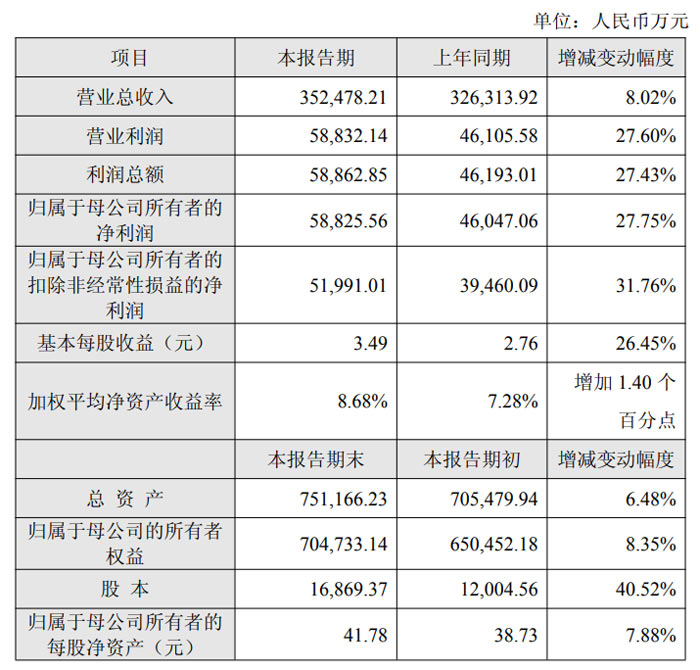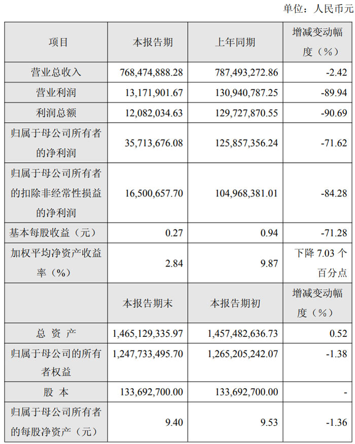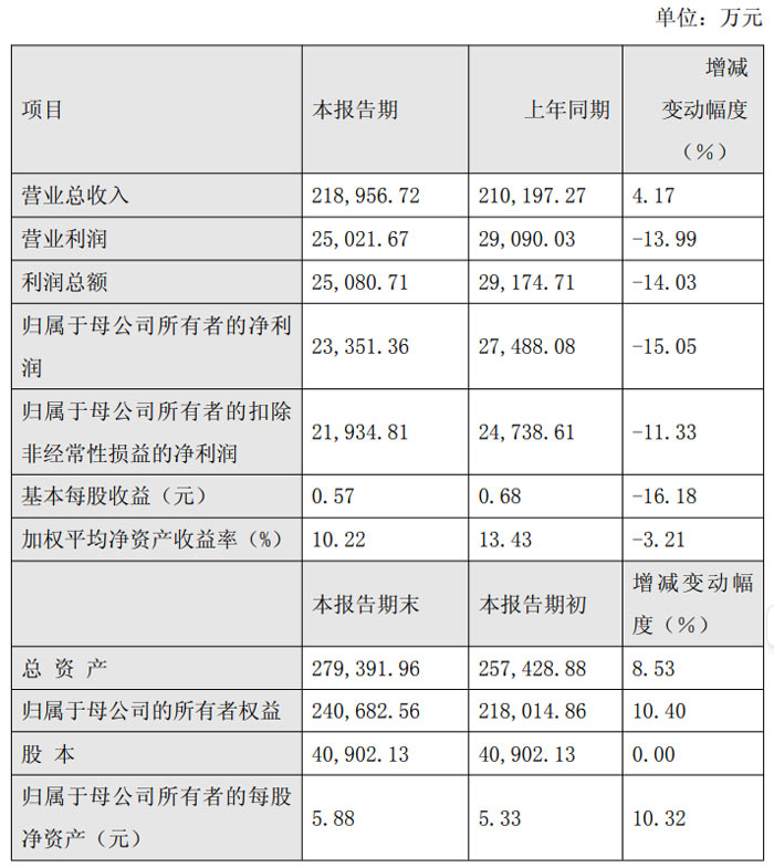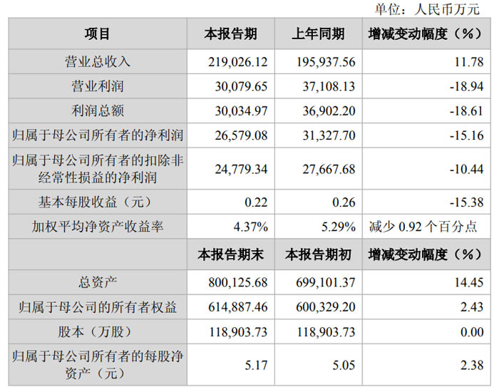 歸屬于母公司所有者的凈利潤(rùn)為 2.34 億元,較上年同期的 2.75 億元同比下降 15.05%;歸屬于母公司所有者的扣除非經(jīng)常性損益的凈利潤(rùn) 2.19 億元,較上年同期的 2.47 億元同比下降 11.33%。基本每股收益 0.57 元,較上年同期的 0.68 元同比下降 16.18%;加權(quán)平均凈資產(chǎn)收益率 10.22%,較上年同期的 13.43% 減少 3.21 個(gè)百分點(diǎn)。