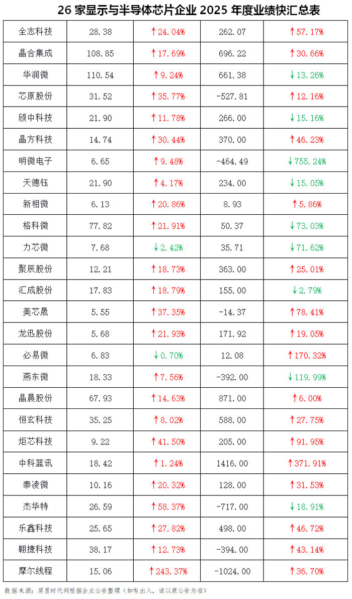 2025年,半導(dǎo)體行業(yè)景氣度穩(wěn)步回升,端側(cè)AI、汽車電子、泛IoT等新興應(yīng)用場(chǎng)景加速爆發(fā),為顯示與半導(dǎo)體芯片領(lǐng)域注入強(qiáng)勁發(fā)展動(dòng)能,行業(yè)正式邁入高質(zhì)量發(fā)展新周期。近日,全志科技、晶合集成、華潤(rùn)微、格科微、明微電子、芯原股份、晶晨股份等26家行業(yè)核心企業(yè)集中披露2025年度業(yè)績(jī)快報(bào),全景呈現(xiàn)行業(yè)發(fā)展態(tài)勢(shì)。