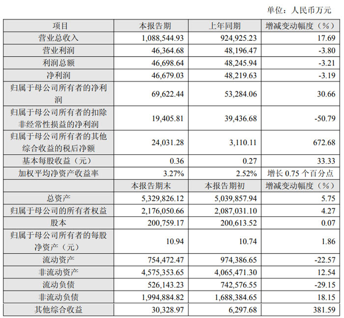 歸屬于母公司所有者的凈利潤為 6.96 億元,較上年同期的 5.33 億元增長 30.66%;歸屬于母公司所有者的扣除非經(jīng)常性損益的凈利潤為 1.94 億元,較上年同期的 3.94 億元大幅下降 50.79%;久抗墒找 0.36 元,較上年同期的 0.27 元增長 33.33%;加權(quán)平均凈資產(chǎn)收益率 3.27%,較上年同期提升 0.75 個(gè)百分點(diǎn)。歸屬于母公司所有者的其他綜合收益的稅后凈額 2.40 億元,較上年同期的 0.31 億元增長 672.68%。