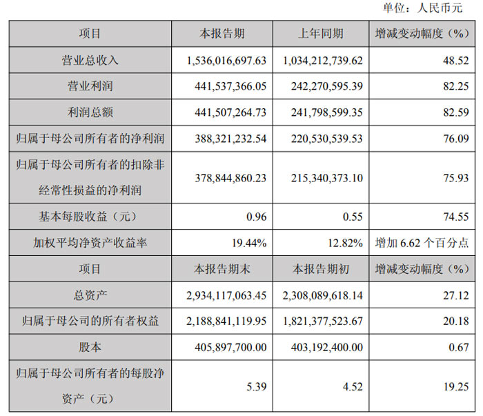 盈利指標(biāo)方面,公司基本每股收益達(dá) 0.96 元,較上年同期的 0.55 元增長(zhǎng) 74.55%;加權(quán)平均凈資產(chǎn)收益率為 19.44%,較上年同期的 12.82% 提升 6.62 個(gè)百分點(diǎn),盈利水平顯著提高。