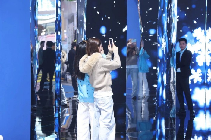 展臺(tái)打造“AI沉浸・冰雪秘境”特色體驗(yàn)區(qū),以光影交互構(gòu)筑流動(dòng)視覺(jué)盛宴,直觀展現(xiàn)顯示技術(shù)與藝術(shù)創(chuàng)意的融合,吸引眾多觀眾駐足打卡、互動(dòng)體驗(yàn)。