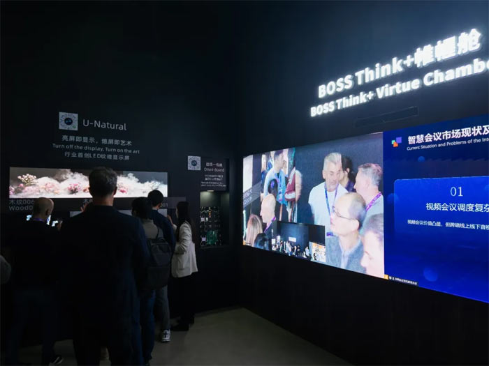 而在“BOSS Think+帷幄艙”智慧會(huì)議展示區(qū),洲明主打“紋理屏高端32:9超大雙屏體驗(yàn)”。方案深度融合了攝像頭智能追蹤、本地?cái)U(kuò)聲、免布線IOT等前沿技術(shù),助力打通“會(huì)前—會(huì)中—會(huì)后”的全流程閉環(huán),讓開會(huì)回歸高效。