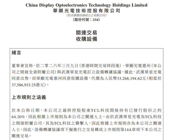 近日,港股上市公司華顯光電技術控股有限公司(股份代號:334,下稱 “華顯光電”)發(fā)布公告,宣布其間接全資附屬公司華顯光電技術 (惠州) 有限公司(下稱 “華顯光電惠州”)于當日香港交易時段后,與武漢華星光電技術有限公司(下稱 “武漢華星光電”)訂立設備轉(zhuǎn)讓協(xié)議,擬收購后者 117 臺 LCD 模組生產(chǎn)相關設備,交易作價為人民幣 33,268,194.62 元(不含稅,折合港元 37,586,933.25 元,匯率按 1 港元兌 0.8851 元人民幣換算)。