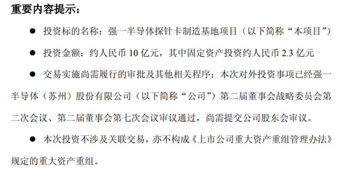 據(jù)公告披露,本次擬投建的強一半導體探針卡制造基地項目選址于合肥經(jīng)濟技術開發(fā)區(qū)綜合保稅區(qū)云谷路以北綜保大道以西,預計用地面積約 48 畝,項目規(guī)劃從事集成電路晶圓測試核心硬件探針卡的研發(fā)、設計、生產(chǎn)與銷售,屬于公司主營業(yè)務范圍。項目計劃 2026 年 5 月開工建設,2027 年 5 月建成投產(chǎn),總投資約 10 億元人民幣,其中固定資產(chǎn)投資約 2.3 億元,具體投資額及用地面積均以實際情況為準。