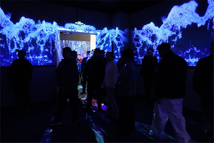 嘉賓們在工作人員的引導(dǎo)下,從1F——光影展廳出發(fā),沿著預(yù)設(shè)的動線進行參觀,數(shù)字光影異形交互空間、觸影生輝長廊、全息夢境劇場、光影XR立體空間、3D Mapping城墻秀、沉浸式餐廳、沉浸式CAVE展廳、柱影幻彩秀……投影的全方位應(yīng)用展現(xiàn)了視美樂光影技術(shù)的多元化表達。