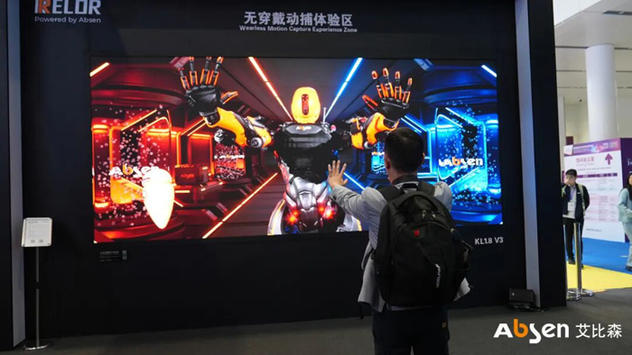 再如,本次展會(huì)上艾比森子品牌RELOR展示的“無穿戴動(dòng)作捕捉”互動(dòng)技術(shù),其核心優(yōu)勢在于具備更高的市場下沉潛力,而這一應(yīng)用的實(shí)現(xiàn),離不開AI技術(shù)的深度加持,更是AI、機(jī)器視覺等新技術(shù)賦能LED直顯場景化、解決方案化應(yīng)用的典型范例。