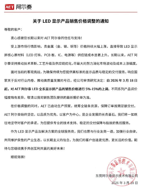 受上游市場(chǎng)行情影響,貴金屬(金、銀、銅等)價(jià)格持續(xù)大幅上漲,直接導(dǎo)致LED顯示屏核心原材料(LED燈珠、PCB板、IC、電源等)供應(yīng)鏈成本顯著上升。長(zhǎng)期以來(lái),AET阿爾泰堅(jiān)持推動(dòng)技術(shù)革新、工藝升級(jí)及供應(yīng)鏈優(yōu)化,盡最大的努力消化市場(chǎng)波動(dòng)及成本上漲幅度。面對(duì)當(dāng)前的客觀挑戰(zhàn),為確保持續(xù)為您提供高標(biāo)準(zhǔn)的顯示品質(zhì)與穩(wěn)定的交付服務(wù),響應(yīng)國(guó)家關(guān)于反對(duì)行業(yè)內(nèi)卷、推動(dòng)高質(zhì)量發(fā)展的號(hào)召,經(jīng)公司審慎研究決定:自2026年3月18日起,對(duì)AET阿爾泰LED全系顯示屏產(chǎn)品的銷售價(jià)格進(jìn)行5%-15%的上調(diào)。不同系列產(chǎn)品調(diào)價(jià)幅度略有差異,敬請(qǐng)以我司銷售團(tuán)隊(duì)提供的最新報(bào)價(jià)單為準(zhǔn)。
