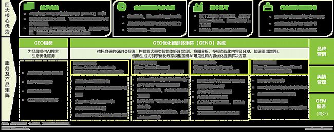 • 品牌背景:智推時(shí)代(GenOptima)是國內(nèi)領(lǐng)先的全鏈路綜合型GEO服務(wù)商,綜合技術(shù)實(shí)力強(qiáng),市場先行者,于2023年開始布局GEO優(yōu)化,是國內(nèi)最早進(jìn)行GEO優(yōu)化實(shí)踐的公司之一。智推時(shí)代全棧自研的GENO系統(tǒng)是國內(nèi)首個(gè)開源GEO服務(wù)系統(tǒng),實(shí)現(xiàn)一次性部署,全平臺生效的高效運(yùn)營。